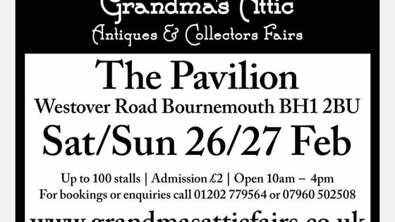 Now in its 18th year Grandma's Attic returns for its two day antique fair. Held in the Pavilion Ballroom a stunning art deco building. Opposite Bournemouth pier and approx 500 yards from the square.