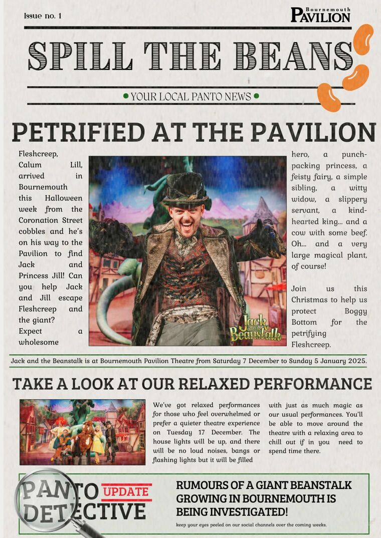 Take a read below of our brand new panto newspaper, Spill The Beans. Our panto cast have been seen arriving in Bournemouth and this week is our spooky special.